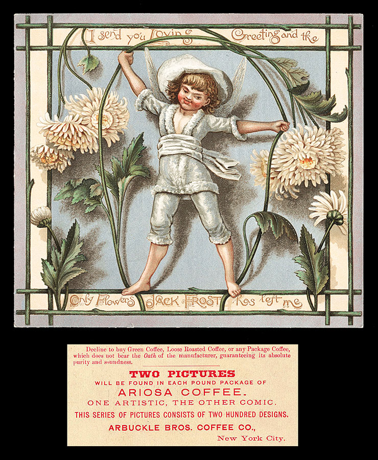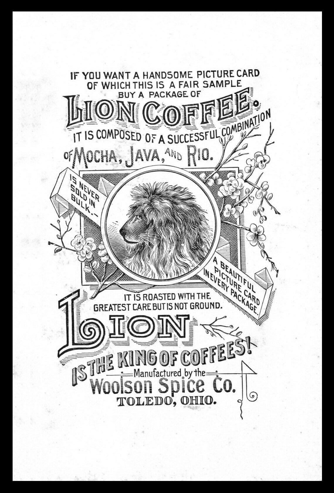 Lion coffee made a seemingly endless series of offers of one kind or another. As mentioned on this trade card back, one manner of distribution and a sales stimulator was the placement of a colorful chromo card in each package of coffee.