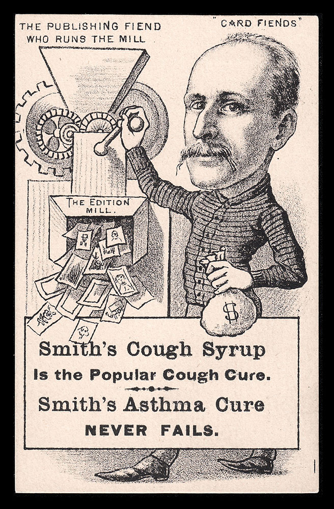 This is one of a series about “card fiends” . . . avid collectors of trade cards to mount in albums or otherwise save. As do some other cards, this one also sees to criticize the publishers who crank out vast numbers of such cards in order to make a buck one way or another.