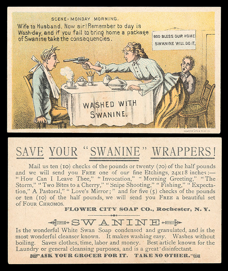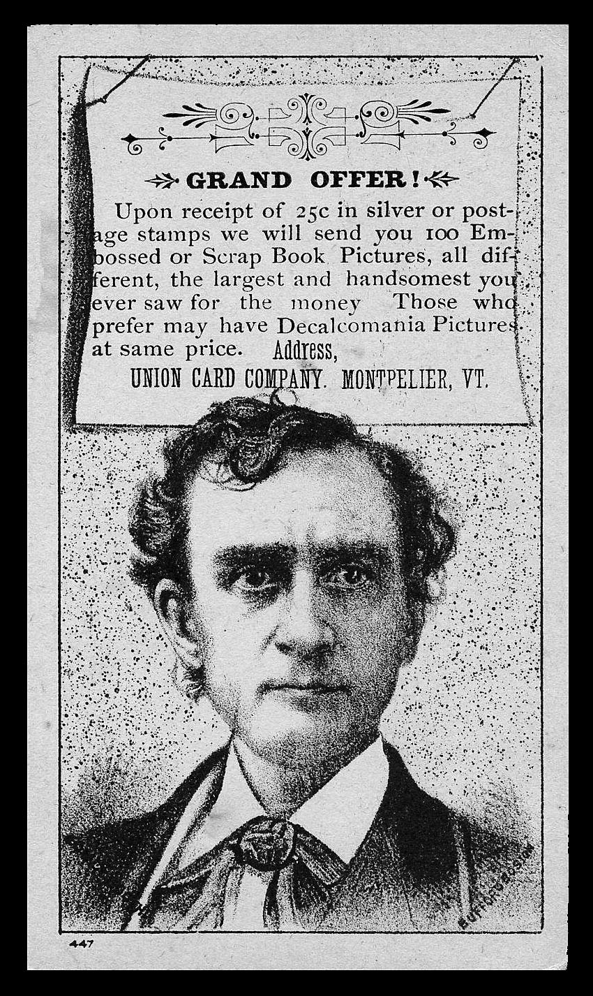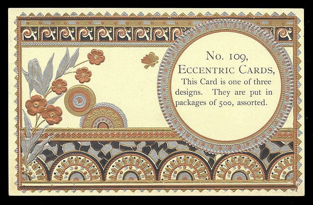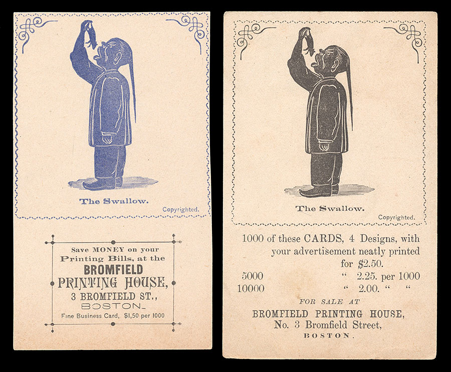 One interesting aspect of studying trade cards and other sorts of ephemera is that insights can be gained from those examples of ephemera which reference ephemera itself. This includes text which reveals how items were produced, circulated, offered as premiums and used to promote. Here are some examples; many others are out there awaiting scrutiny.