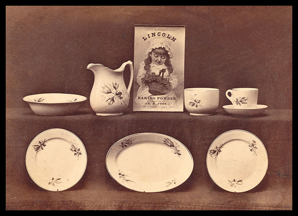 A trade card shown on an advertising carte de visite. The dishware may or may not (?) have been premiums on offer from Lincoln baking powder.