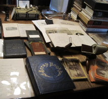 There’s no photography allowed at the Ransom Center (although it owns the world’s oldest photograph taken with a camera), but we were welcomed with a carefully chosen selection of ephemera. The parents of our Director Tamar Zimmerman had known photography historians Helmut and Alison Gernsheim, and so items from that collection (purchased by Harry Ransom in 1963) were displayed for us. Linda Briscoe Myers, Research Associate of the Photography Collection, showed us an extraordinary scrapbook kept by Edward Charles Blount 1867-75 that combined photographs in imaginative watercolor collage. Three fellowship students showed material they researched: Sarah Carlson, menus; Caroline Johnson, production materials for the series Mad Men (she is also interested in women aviators such as Harriet Quimby); and Virginia Seymour, the archive of Joe E. Ward, a clown from the 1920s-60s.