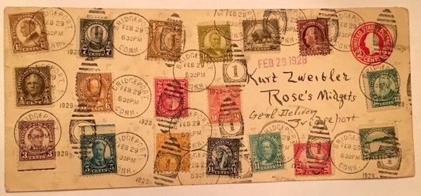 I do, however, collect stories, and holding this cover made me want to learn more about it. What could have required $2.15 postage, eighty-eight years ago? And why was this letter, addressed to Kurt Zweibler, Rose’s Midgets, Genl Delivery, Bridgeport, mailed in the same city on Leap Day, 1928?