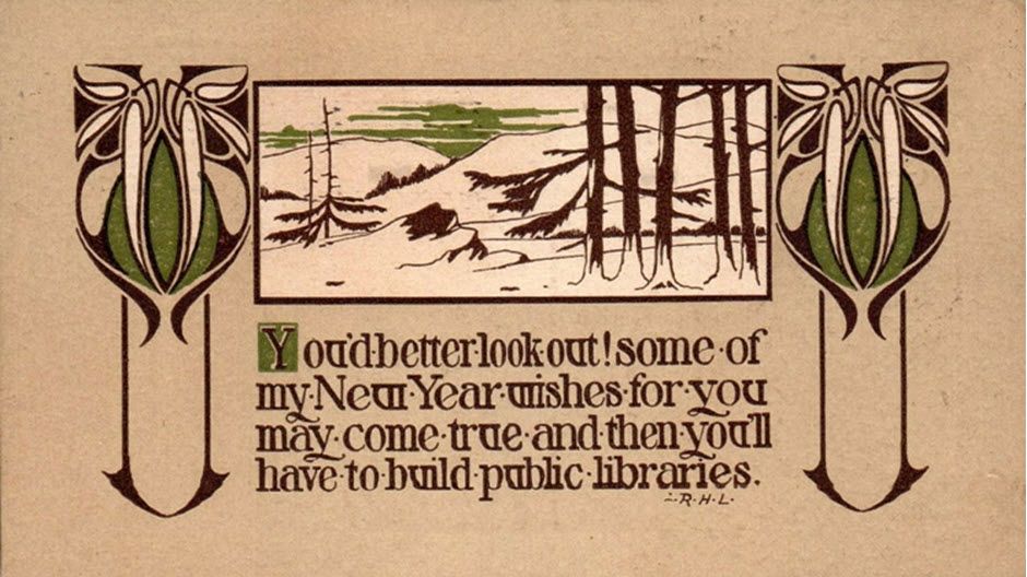 An example, spotted by ESA President Richard Sheaff, is this 1911 New Year’s postcard from the A. M. Davis Company of Boston. Its cheerfully archaic hand-lettering reads, “You’d better look out! Some of my New Year wishes for you may come true and then you’ll have to build PUBLIC LIBRARIES.”
