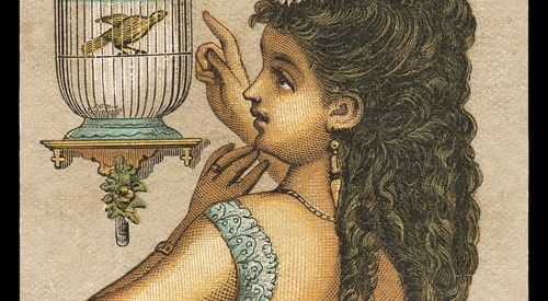 The girl (or woman)-with-bird-in-cage motif was universally popular in the Victorian era simply because the keeping of bird was culturally in vogue at that time.