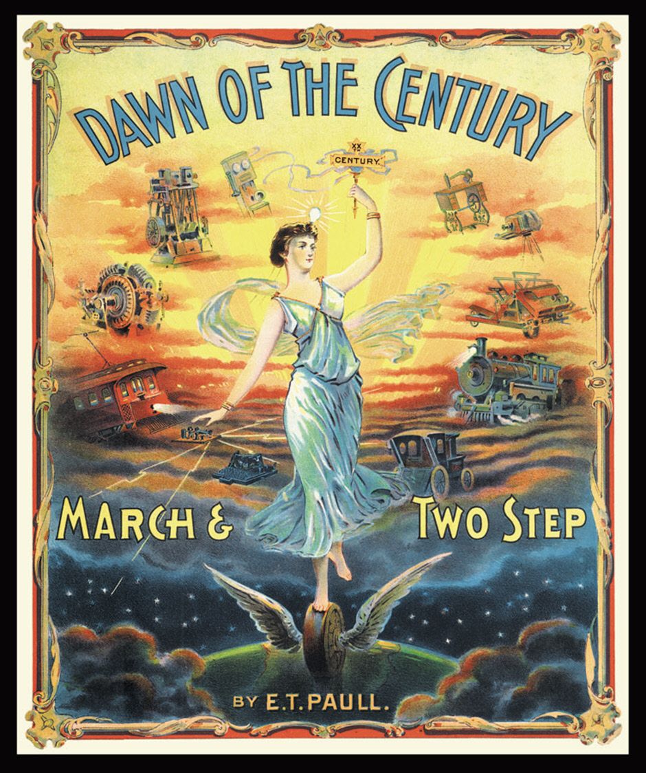 The chromolithographed cover of the sheet music for the Dawn of the Century March & Two Step, by E. T. Paull celebrated an array of modern wonders, including the telegraph, telephone, typewriter, horseless carriage, Corliss engine, steam locomotive, farming equipment, modern camera, turbine, sewing machine and electric street railway.