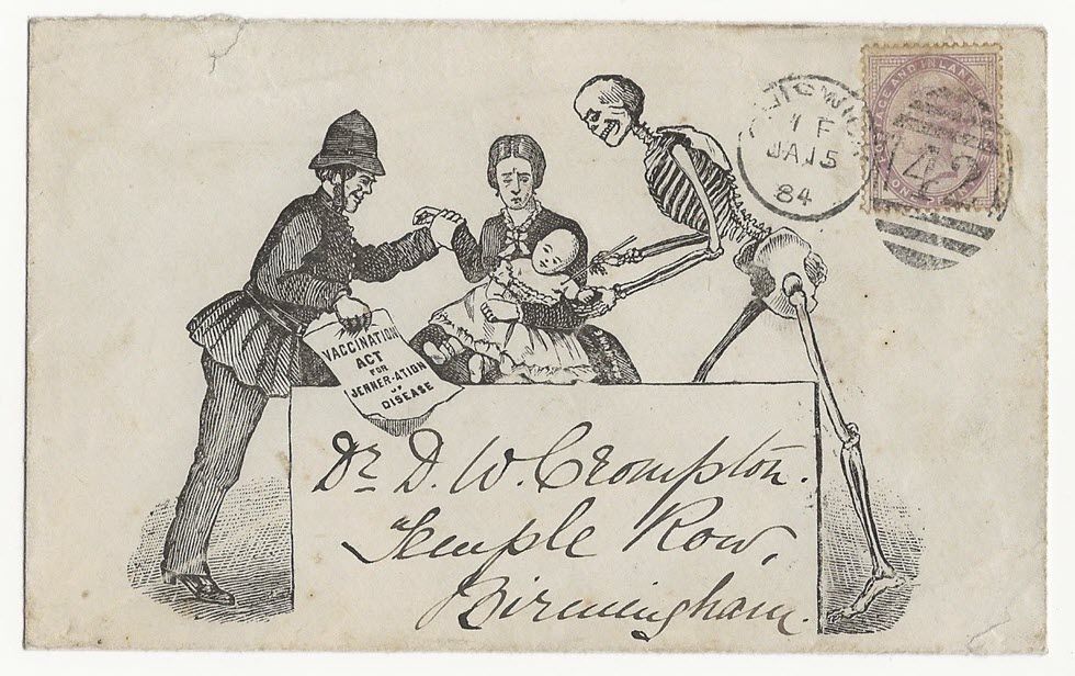 This is an envelope postmarked 1884 showing Anti-Vaccination propaganda in the illustration on the front of the envelope. The image is of a Vaccination Officer presenting the Vaccination Act to a mother while her child is vaccinated by “death” in the form of a skeleton. The envelope is addressed to Dr. D. W. Crompton, the Consulting Surgeon at The General and Queen’s Hospitals in Birmingham, England. The envelope is a rare example and is in good condition.