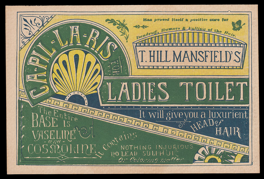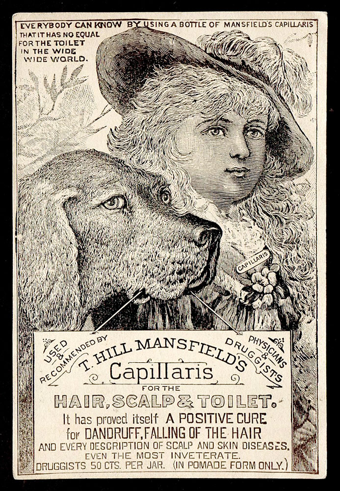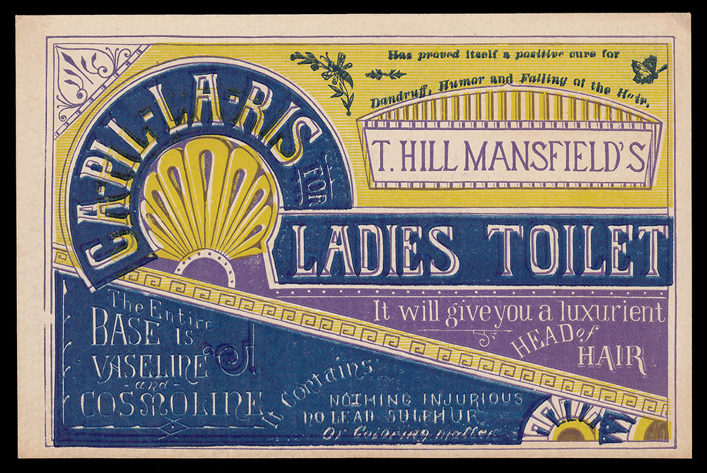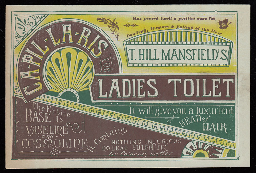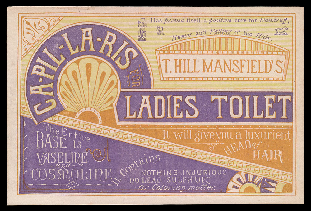 T. Hill Mansfield of Portland, Maine  put out quite a few different trade cards for his Capillaris (sometimes Ca-Pill-Lar-Ris) vaseline + cosmoline hair treatment ointment. The cards with this wood-engraved design are interesting for the number of varieties which exist. For one thing, there were at least three different printings, as evidenced by minor design differences to seen in the upper right area of the cards. The one shown above has only a simple pointy fleuron above Mansfield’s name. Four others have added wording, plus a butterfly and other typographic “dingbats.” Three others shown have the wording plus different “dingbats.”