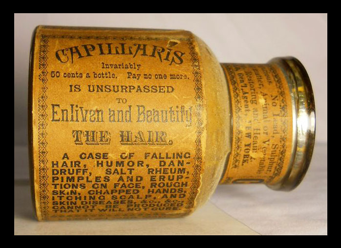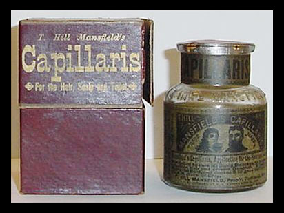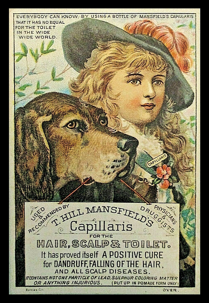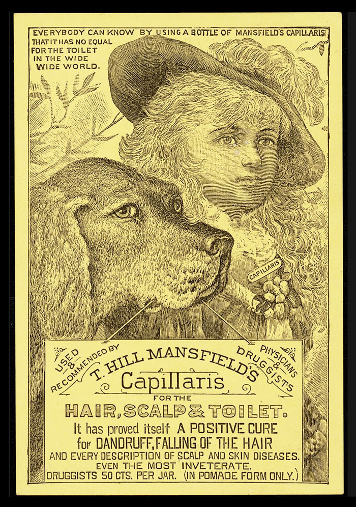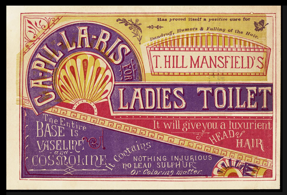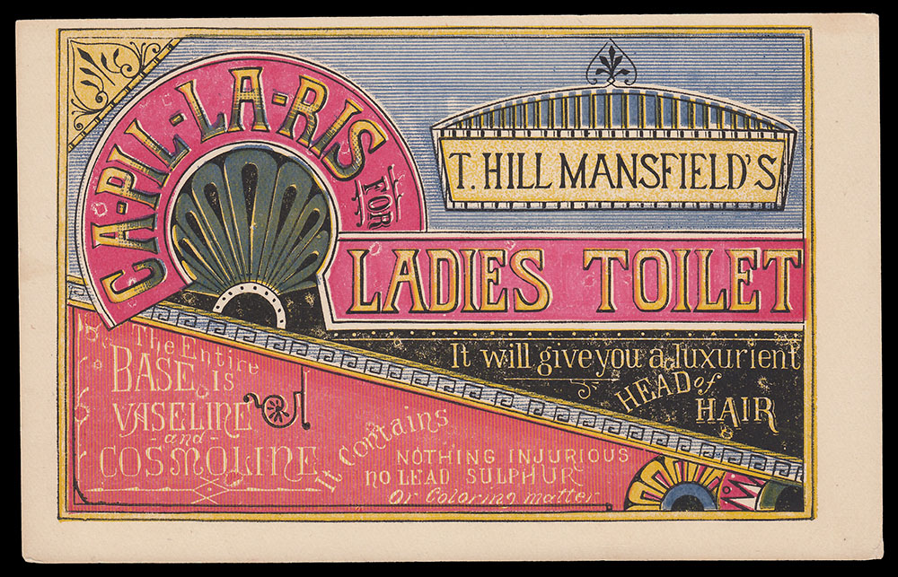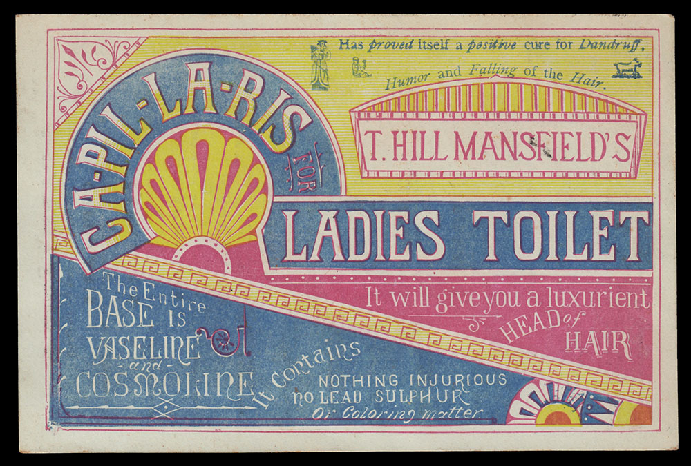 T. Hill Mansfield of Portland, Maine  put out quite a few different trade cards for his Capillaris (sometimes Ca-Pill-Lar-Ris) vaseline + cosmoline hair treatment ointment. The cards with this wood-engraved design are interesting for the number of varieties which exist. For one thing, there were at least three different printings, as evidenced by minor design differences to seen in the upper right area of the cards. The one shown above has only a simple pointy fleuron above Mansfield’s name. Four others have added wording, plus a butterfly and other typographic “dingbats.” Three others shown have the wording plus different “dingbats.”