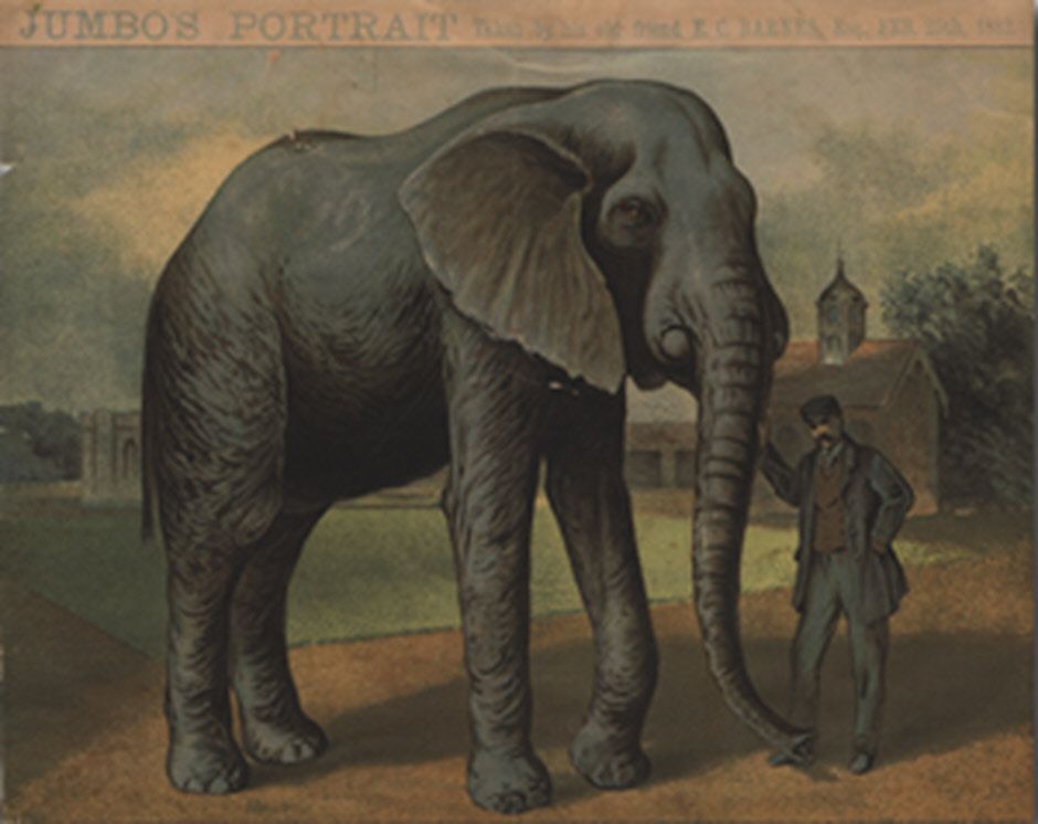 In 1861, Jumbo was born in sub-Saharan Africa, captured, taken to Cairo, and sold to a zoo in Paris. Because the Paris zoo had too many elephants in 1865, he was traded to London’s Zoological Gardens for a rhinoceros. The small, sickly elephant showed little potential for either international fame or national controversy. But, under the careful attention of his keeper, Matthew Scott, the elephant grew to the enormous height of 11 feet and weight of 6 1/2 tons. His trunk was 27 inches in circumference. In short, he was the biggest elephant known.