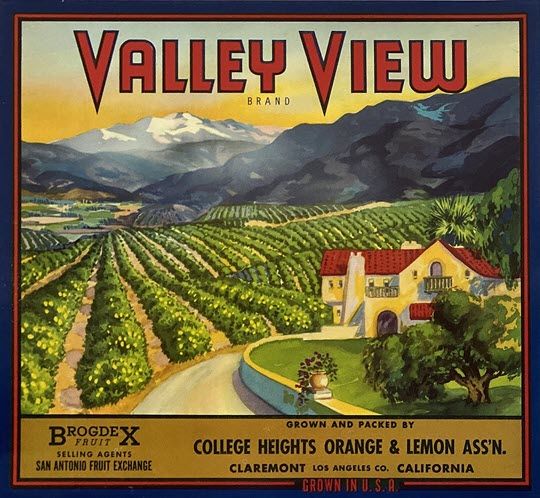 Valley View citrus crate label, litho printer unknown, circa 1930s (size 11”x 10”). This could be considered a stock label, as many different packers and brand names have used this scene of an orchard, with a hacienda, near a mountain range.