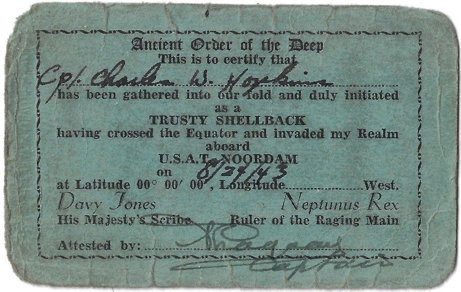Wrong. On August 24, 1943 you’re being dunked by a ceremonial King Neptune as your Transport crosses the Equator, and you cross it for the first time! Anyone who has traveled by ship crossing the Equator will recall the traditional ceremony which is like – but in no way related to – baptism by immersion! What is surprising is that it would take place in the middle of a war.