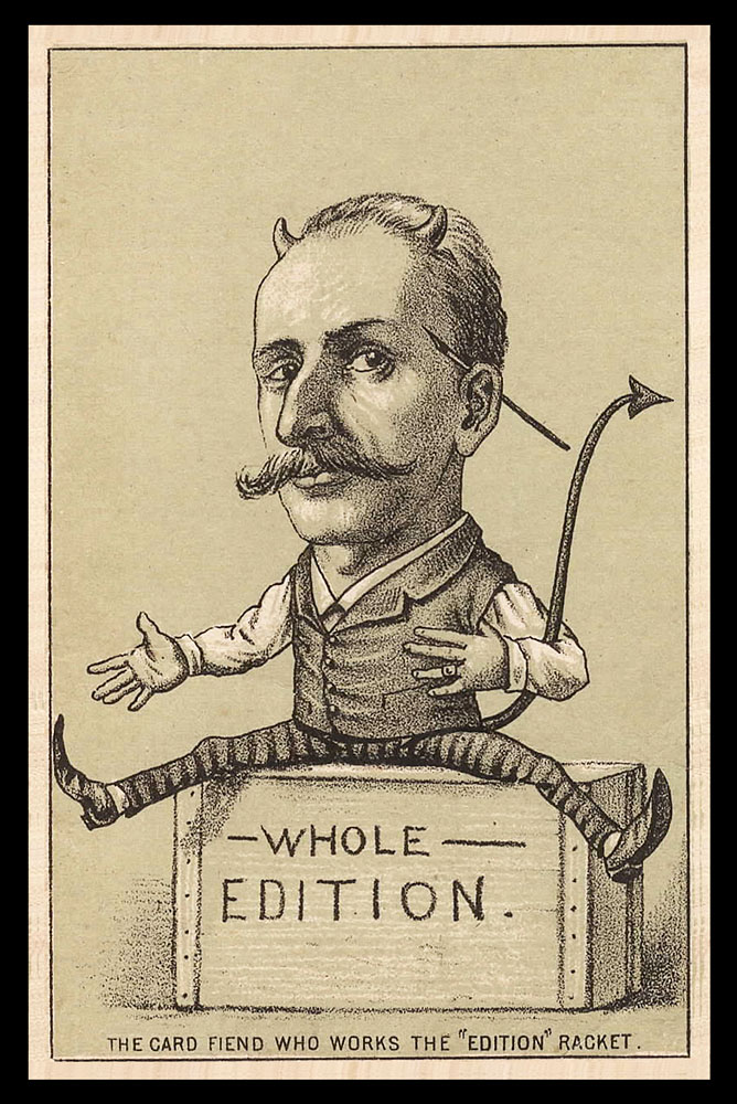 This is one of a series about “card fiends” . . . avid collectors of trade cards to mount in albums or otherwise save. As do some other cards, this one also sees to criticize the publishers who crank out vast numbers of such cards in order to make a buck one way or another.