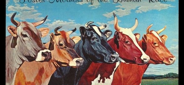 A 1961 postcard with nicely painted portraits of (left to right) a Brown Swiss, Jersey, Holstein, Ayrshire, and Guernsey cow.
