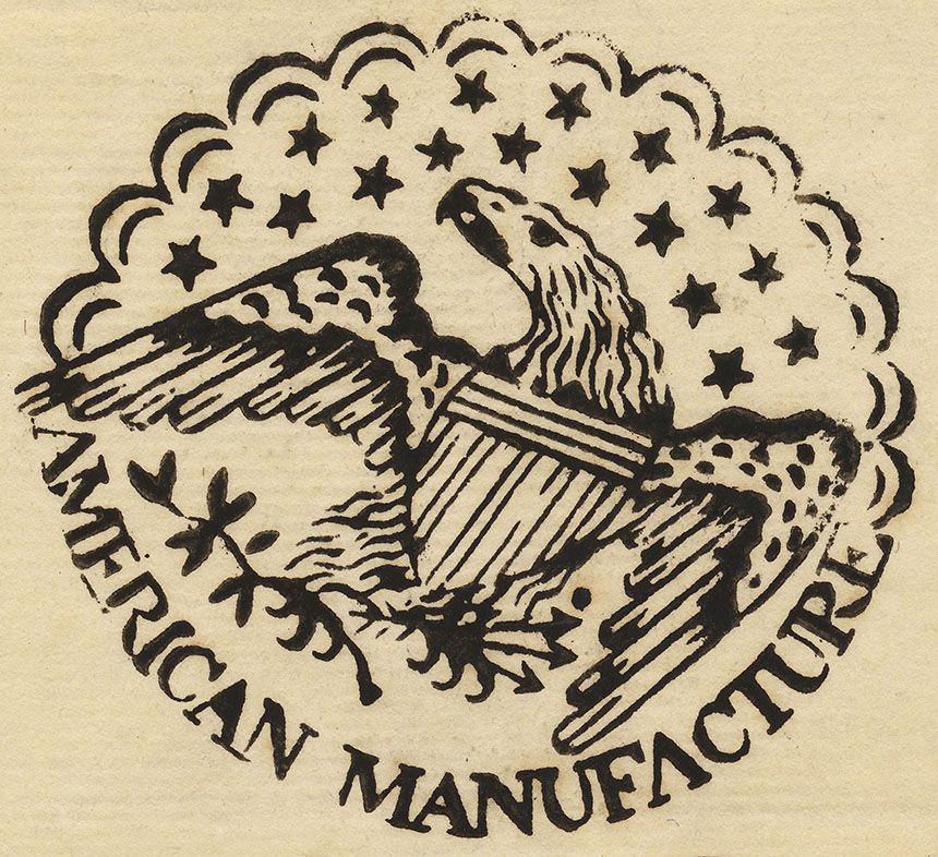 Many items of historical ephemera bring fresh things to think about, new subjects to explore. An impulse buy at one ESA annual auction lead me down some interesting roads. The lot was an 1809 billhead/receipt with an unusual and interesting eagle-and-stars device at the top, surrounded by the words “AMERICAN MANUFACTURE.” The document struck me as a bit odd in that it bore no company name or location.