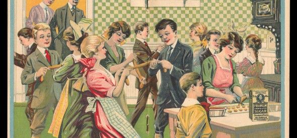Below is the center spread from an early 20th-century booklet promoting the healthful properties of processed sugar. Here it reads, “Give the whole family a treat and surprise them with a Candy Pulling party . . . The principal ingredient is just Cane Sugar with utmost food value and absolute purity. The young folks will all go home full of good things, and with no ill effects from their indulgence.”