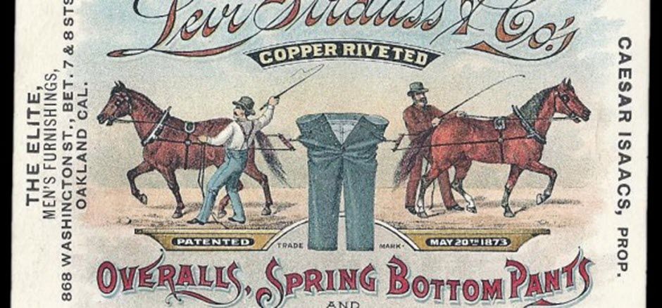 Exaggeration abounded in mid-to-late-nineteenth century imagery, for comic effect and/or to emphasize product features. One oft-repeated graphic, in numerous variations, showed a pair of pants resisting mighty efforts to pull it apart. This may have originated with Levi Strauss, who used that visual to sell its new, tough canvas denim jeans, which the company created originally with California gold miners in mind.