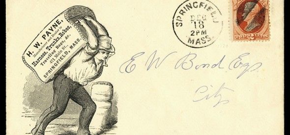 To make a personal long long story very very short, I was a stamp collector before I was an ephemera collector. But the more 19th-century stamps on envelopes I saw, the more I began finding my eyes roving to the left, finding myself less interested in the postage stamp at the upper right, or its cancellation; increasingly more interested in the words and graphics off to the left.